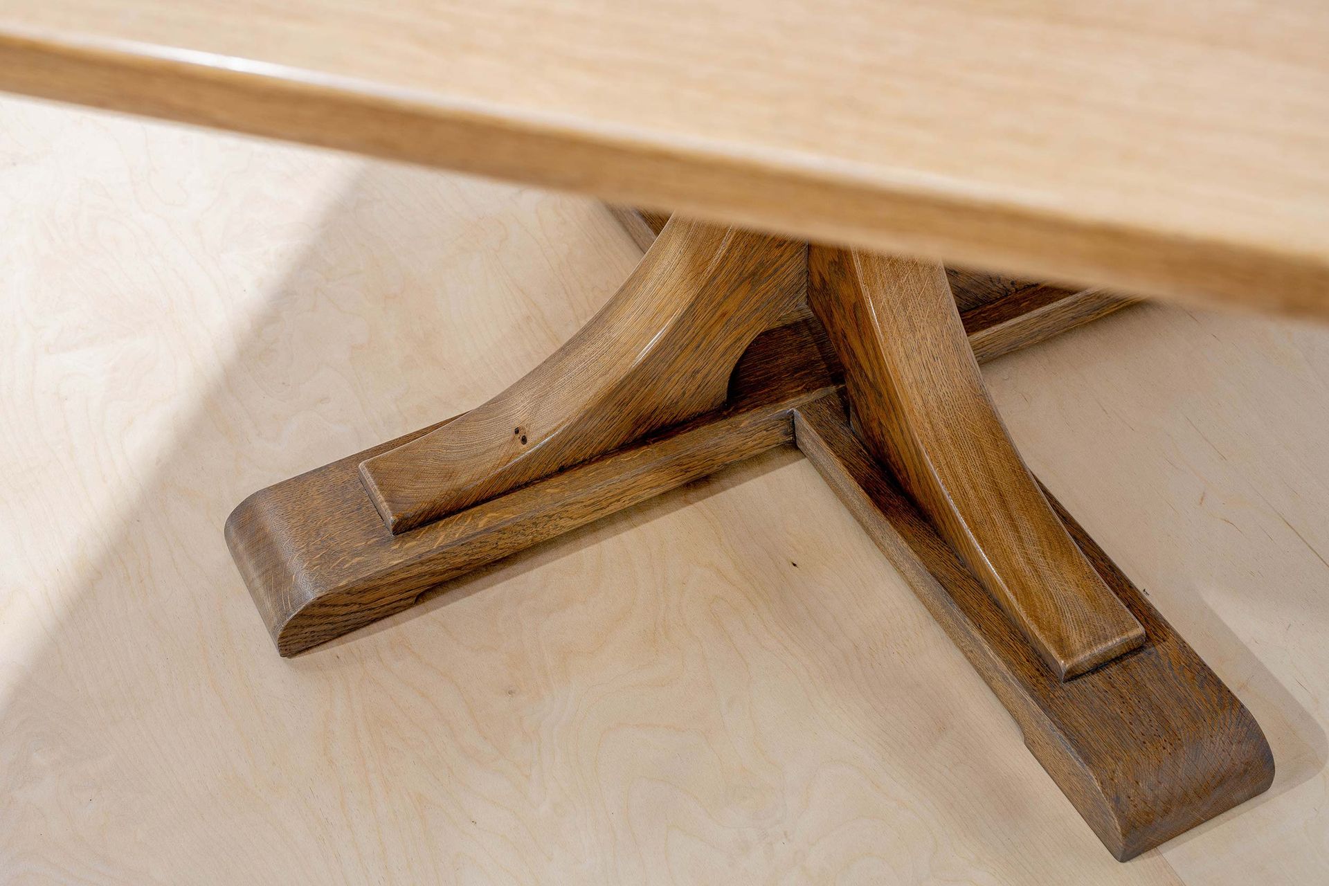 This kitchen dining table was made in English oak from the Stock Gaylard Estate. Curved legs were jointed to form a pedestal with a square top to fit the right-angled bench seating in the kitchen.
